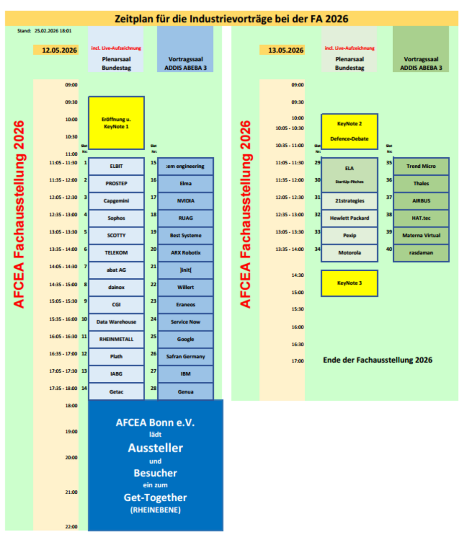 Bei Fragen zu den Industrievorträgen wenden Sie sich bitte an Herrn Rainer H. Schillings, stvLtrFA(at)afcea.de .