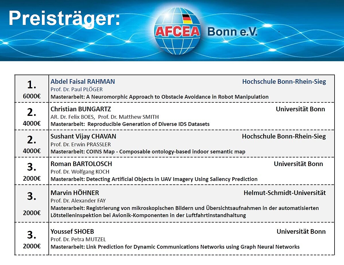 Den ersten Platz erreichte Ahmed Faisal Abdelrahman, der unter Betreuung von Prof. Dr. Paul Plöger an der Hochschule Bonn-Rhein-Sieg eine Masterarbeit zum Thema „A Neuromorphic Approach to Obstacle Avoidance in Robot Manipulation” verfasste.